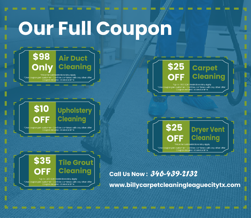 For MoreEven the biggest obstacles can be solved with our blot removal rug aid, even though discoloration and smells can be very difficult to deal with. Whether it's pet macula, red wine or coffee spills, our crew has the mastery and the right products to remove them without damaging your floor mat. Our deodorization technique also confirms that any unpleasant aromas are completely eliminated, leaving your carpets fresh and clean. Our group at Billy Carpet Cleaning League City Texas is highly trained in giving certified floor covering purification care. We use modern machines and eco friendly purging resolutions to deliver the best results. Deep tidying up is essential for high traffic areas which tend to accumulate more dirt and wear over time. Get a free estimate by contacting us right now.
